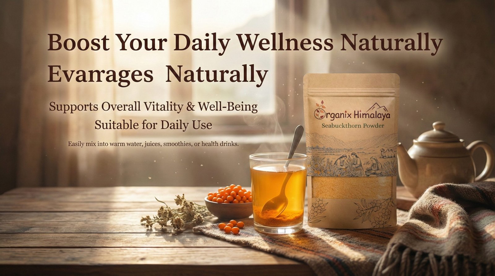 Boost your daily wellness naturally with Organic Seabuckthorn Immunity Booster, made from premium quality seabuckthorn berries. Known for their rich nutritional profile, seabuckthorn berries are packed with essential vitamins, antioxidants, and natural goodness that support overall vitality.